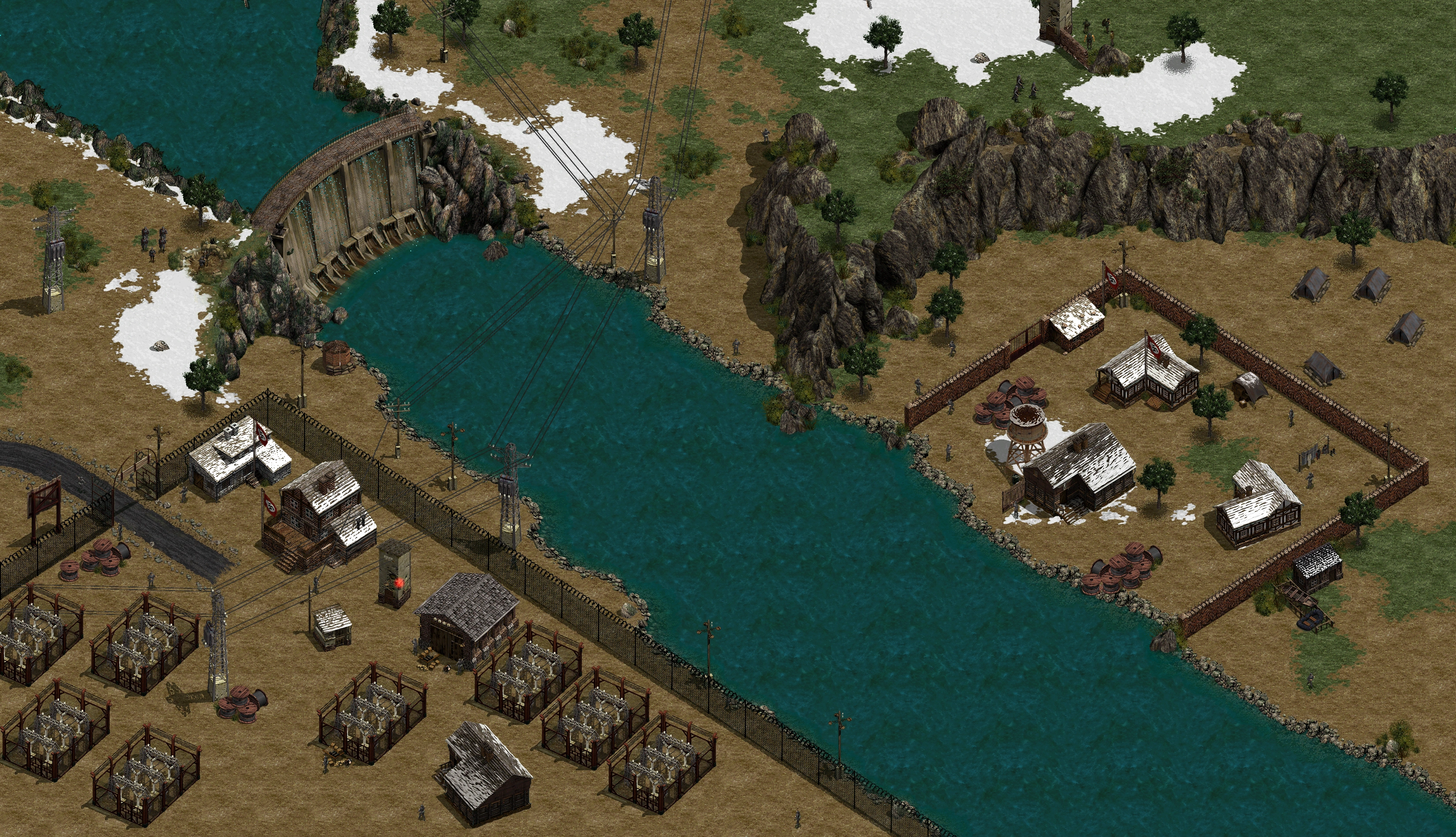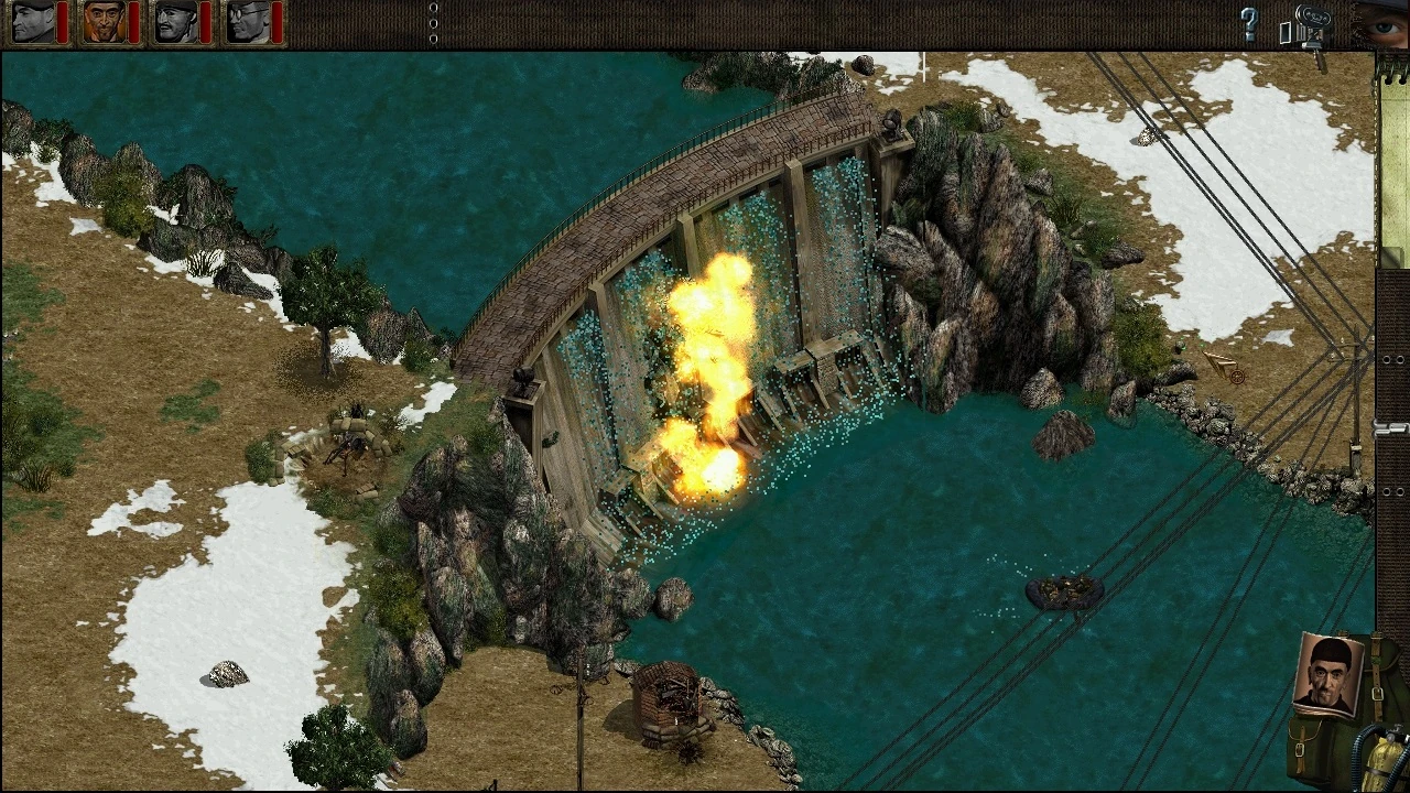 Officer, you are going to approach the area from the north... ...and demolish the dam with explosives placed in the base. You'll have to steal some powerful charges from inside the transformer station. Remember only your sapper can handle them. The perimeter of the station is electrified, but the fence circuit can be turned off with this control switch. The spy in your unit is able to impersonate any German commander. Just get him a German uniform and enemy soldiers will do nothing but salute him all the way. After your task is complete, a truck will come to pick you up north from your position. This is not an easy mission, officer. Only the perfect co-ordination of your men will ensure success. Be sure everyone knows his place. Thank you. That is all.